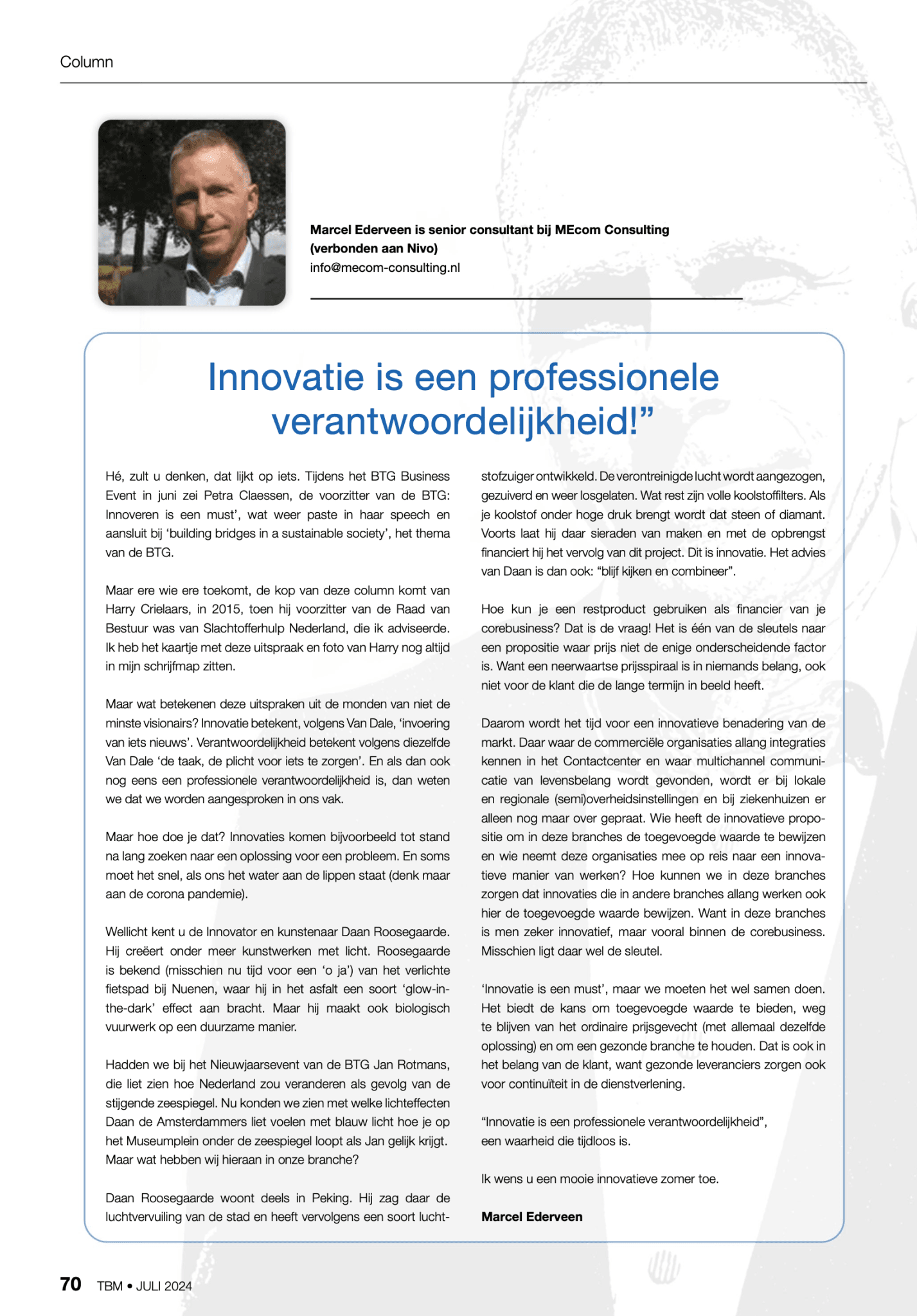 Innovatie betekent, volgens Van Dale, ‘invoering van iets nieuws’.Verantwoordelijkheid betekent volgens diezelfde Van Dale ‘de taak, de plichtvoor iets te zorgen’. En als dan ook nog eens een professionele verantwoordelijkheid is, dan weten we dat we worden aangesproken in ons vak.